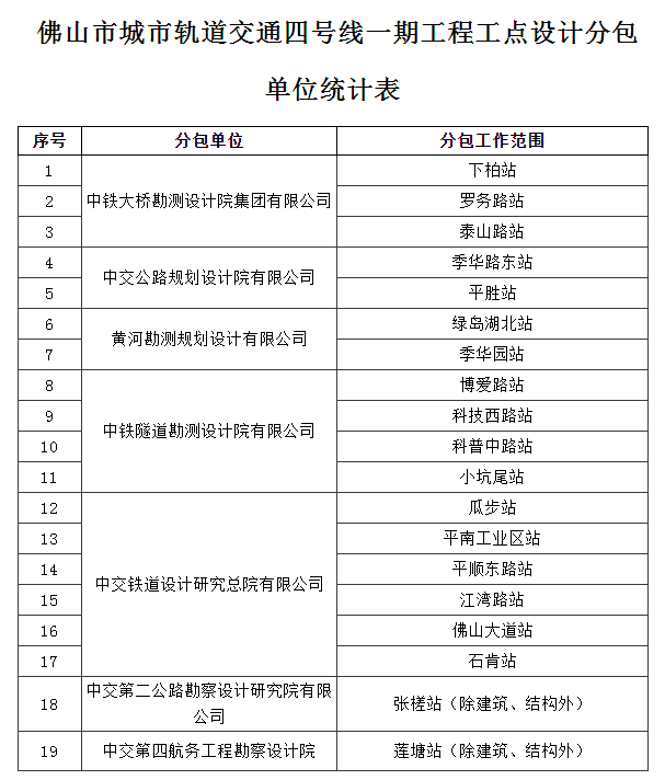 目前,佛山铁投对佛山地铁4号线一期工程工点进行了分包,将把其中19个站点规划设计交给7家公司来实施。