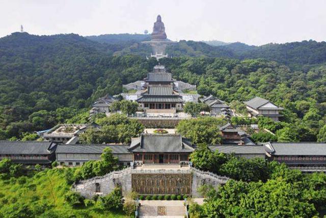 西樵山距离佛山仅34.4公里,山上最有名的景观就是观音像,观音像在海拔不到300米的小峰上,法相大概有20层楼高,是世界上最高的观音坐像,底部有莲花座拖着,在景区内基本都能看到。观音像是南海观世音菩萨的坐像,手捏禅指,宝相庄严。