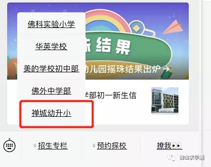 点击底部子菜单栏的“招生专栏”,选择“禅城幼升小”专栏登录“佛山市柒伍柒科技有限公司招生系统”进行网上报名。