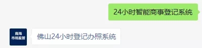 (二)关注“南海市场监管”微信公众号并进入聊天页面,文字回复“24小时智能商事登记系统”进入页面办理。