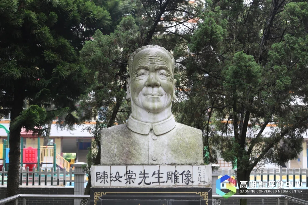 推开牌坊下的铁门,走进里面,可见两排四季青以及一座约两米高的雕塑在此静穆而立。四方脸、宽额广颐、面含微笑,浓眉下眼神温和敦厚,这便是高明县立第三小学的创办者——陈汝棠先生。