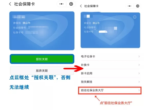 ③人脸识别成功后直接进入社保卡关联界面,点击“授权关联”-“前往社保业务大厅”。