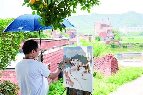沧江河畔,画家在明阳村写生创作。/佛山日报记者洪海摄