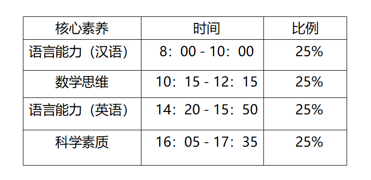 语言能力(30%)、数学思维(30%)、科学素养(40%)