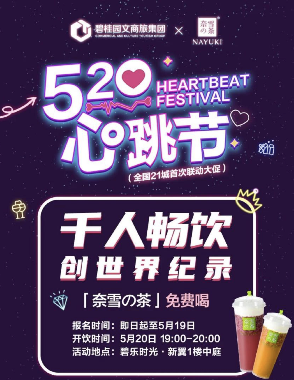 随着“后浪”崛起,“Z世代”青年逐渐成为商业消费市场的主力军。随之而来的,是“颜值即正义”、“粉丝效应”、“网红经济”等新兴消费趋势。紧抓这一趋势,碧桂园文商旅于此次心跳节探索“网红营销”,跨界网红茶饮品牌 —— 奈雪的茶,推出“千人同饮奈雪”活动,并将尝试申请史上最多人同饮奶茶的世界纪录,展示了碧桂园文商旅在跨界营销和聚焦年轻流量方面的突破式创新。