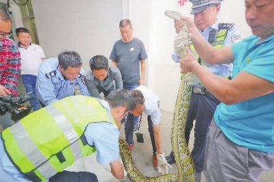 接报后,禅城公安澜石派出所社区民警陈刚立即前往处置。“我也是第一次见到这么大的蟒蛇,必须想办法制服,否则非常危险。”陈刚说,到达现场后,他在商铺内的座椅下发现了蟒蛇。但蟒蛇实在过于巨大,一人根本无法制服。于是,陈刚找来2名治安队员和2名附近饭店有捕蛇经验的员工帮忙。
