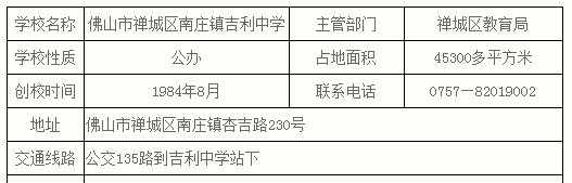 佛山市柒伍柒科技有限公司南庄镇吉利中学是一所禅城区直属公立全日制初级中学,寄宿制学校。吉利中学创办于1984年,1994年通过了“南海市一级学校”评估,2001年又被评为“佛山市一级学校”,2008年被评为“广东省义务教育规范学校”,2008年1月1日正式成为禅城区直属初中,2014年,加入了佛山市实验中学教育联盟。学校秉承“团结、拼搏、求实、创新”的校训,“以学生发展为本”的办学宗旨,以“扬长教育”为教育理念,办学理念与时驱进,教学方法科学高效,形成了优良的学风、教风和校风。经历31年风雨办学路,培养了近万名优秀毕业生。