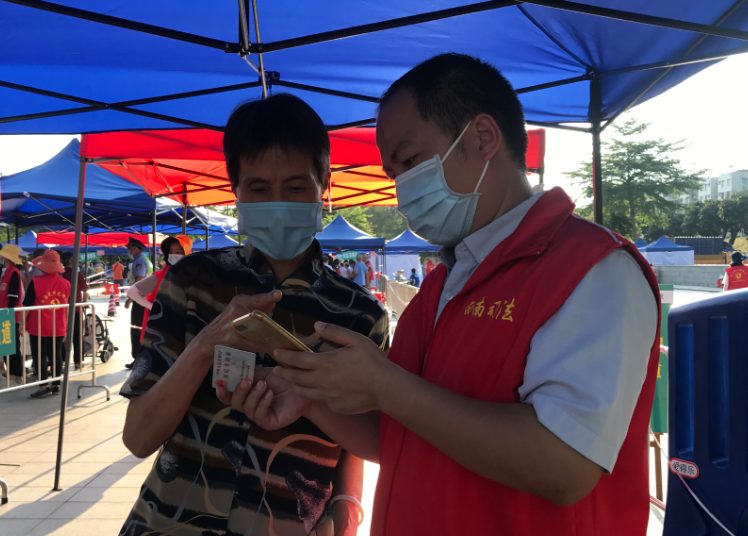 “请有序排队”“请手机出示粤康码进场”“请扫描粤核酸码录入个人信息”……当日现场,职党员和志愿者顶着火辣辣的太阳,耐心地引导着前来检测核酸的居民有序排队、扫码、登记、采样,有条不紊地进行开展工作。