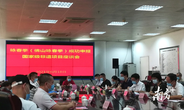 佛山市文化广电旅游体育局召开咏春拳(佛山咏春拳)成功申报国家级非遗项目座谈会。钟碧云 摄