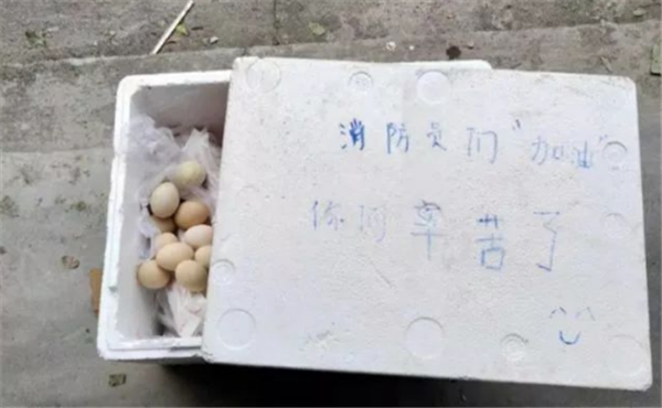 当地一早餐店老板为中山消防救援支队奋战在一线的消防员们送来鸡蛋、饺子、汤粉等早餐,并在保温盒盖上写上一句温韾的关心问候的话:消防员们加油,你们辛苦了。