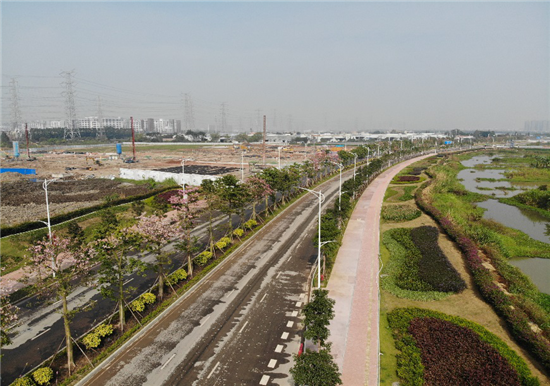 绿地、水系,整合利用,优化改造,这里正逐步形成花园式生态园区。在顺业西路,3公里的黄花风铃木全部盛开的时候,就像一条绝美的“黄金大道”;德富路两侧届时也会呈现壮观的三角梅美景。沿佛江高速以东,近4公里的水系景观改造,将城市外轮廓绿地营造为高速与城市发展片区具有开放属性的天然屏障,强化了水岸绿地与城市的联系。