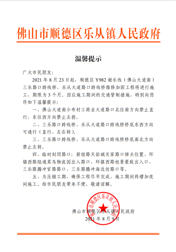 2021年8月6日,顺德公安局发布《关于顺德区Y982谢乐线三乐路口跨线桥、乐从大道路口跨线桥维修加固工程施工交通管制的通告》。