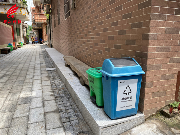 每个村民家门前都放置了两个不同使用功能的垃圾桶。/珠江时报全媒体记者 陈肖玲 摄
