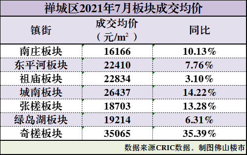 其中奇槎板块7月份均价达35065元/㎡,同比上涨35.39%,环比上涨9.71%。要注意的是,奇槎板块均价同比涨幅较高,主要是由于今年7月份板块内网签成交了7套5.3万/㎡别墅项目,拉高了单月平均值。
