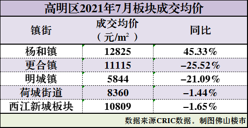 2021年7月份,高明区的住宅成交量主要来自荷城街道板块和西江新城板块,而杨和镇和更合镇板块一手住宅成交均价较高,主要是由于板块内别墅项目的成交价拉高平均值。