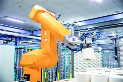 广东溢达纺织有限公司梭织面料厂内,机械臂在运作。