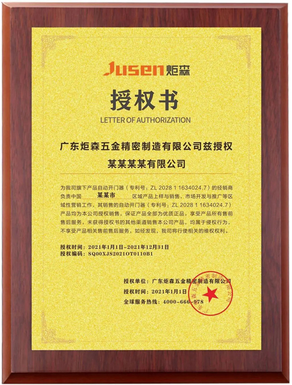 广东炬森五金精密制造有限公司,一直致力于为用户提供高品质的家居生活。炬森OT(One Touch)自动开门器是炬森历时6年,自主研发和引领行业的全新产品,目前已在国内外全面上市销售。现针对日前市场上出现的假冒伪劣,恶意抛售、非法涂改等扰乱市场的行为,既严重伤害广大的炬森用户,又损害我司和各炬森授权代理商的商业信誉,我司特此发布声明。