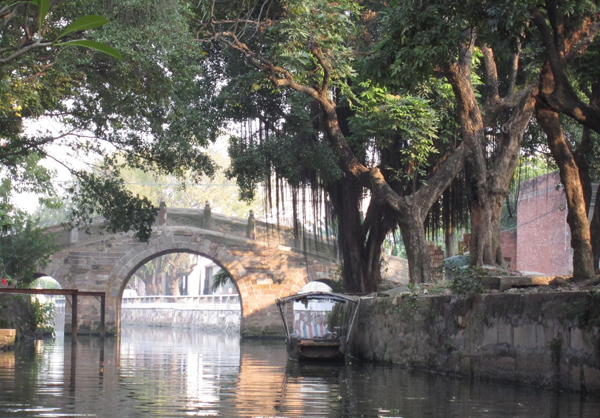 该桥两边斜道不砌石级,行人来往象上下斜坡一样,古代车马过桥,可畅通无阻。站在桥上左右眺望,宽阔的河涌两岸,整齐的石砌墙紧靠河壁。蕉林蔗地上,旧日店铺基础依稀可辨,为我们勾勒出一幅繁荣的古代水乡市集景象。