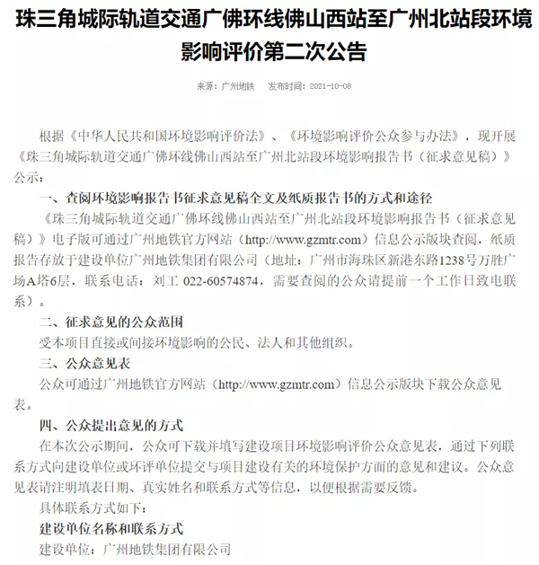 10月8日,广州地铁集团有限公司公示了《珠三角城际轨道交通广佛环线佛山西站至广州北站段环境影响报告书(征求意见稿)》,公示期为10月8日至10月20日。据悉,本工程计划年内开工建设,总工期60个月,佛山境内将新建4座车站。