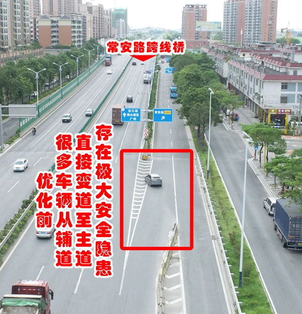 问题:常安路跨线桥往高明大桥方向上桥位置,车辆直接从缺口上桥,对从主路行驶进入辅道的车辆造成影响,存在极大的安全隐患。