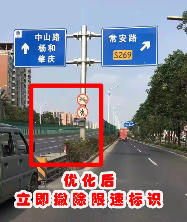 问题:高明大道主路限速80,常安路跨线桥此前限速60的旧标志牌未拆除。