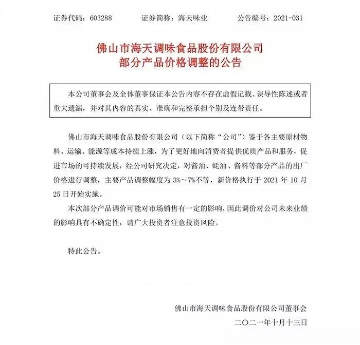 10月13日,海天味业发布公告称,由于各主要原材物料、运输、能源等成本持续上涨,将对酱油、蚝油、酱料等部分产品的出厂价格进行调整,主要产品调整幅度为3%~7%不等,新价格执行于2021年10月25日开始实施。