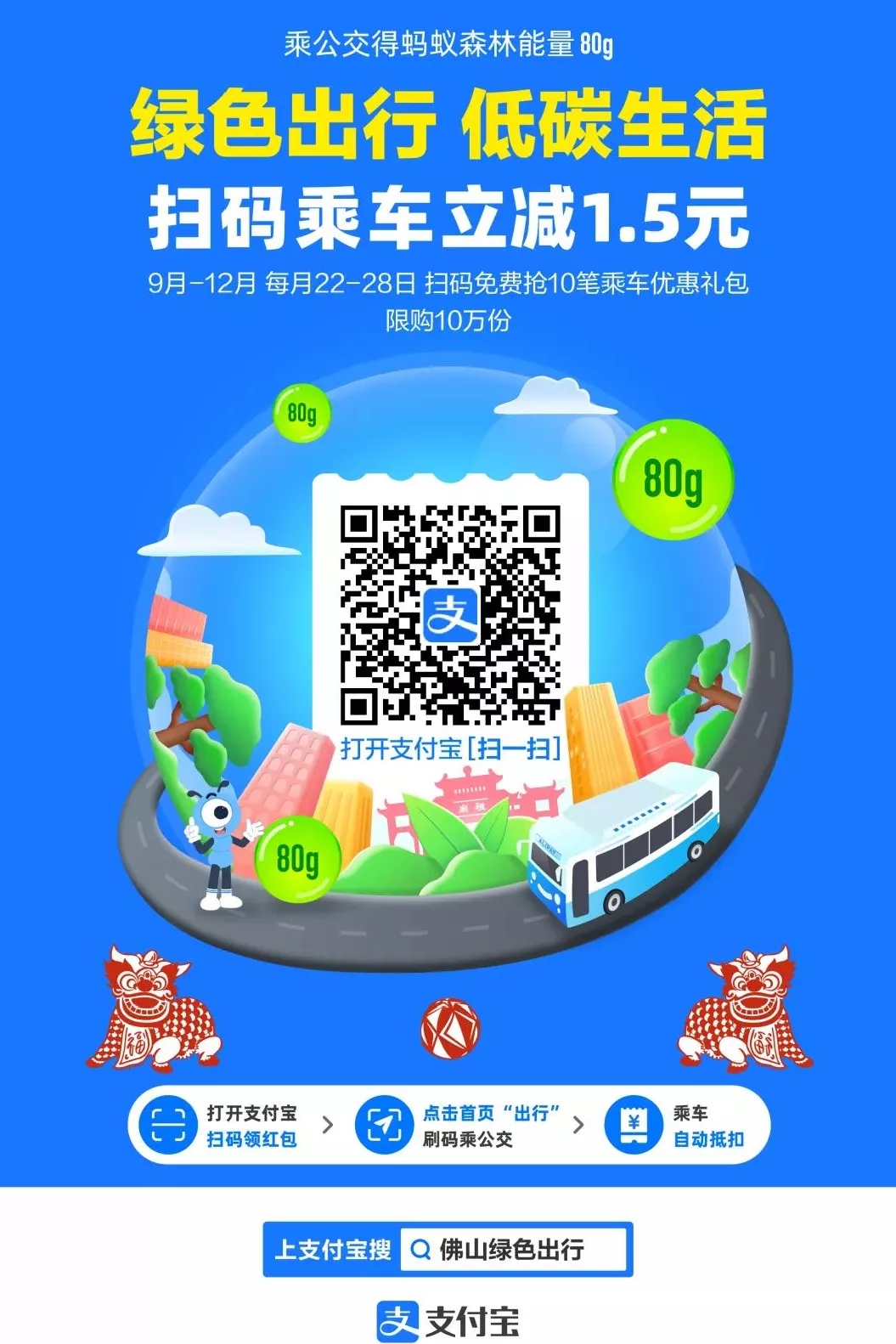 为贯彻落实国家“双碳”战略,鼓励更多市民选择绿色出行,佛山市公共交通管理有限公司联合支付宝,从2021年9月至12月推出“佛山情,低碳行”公交优惠活动。