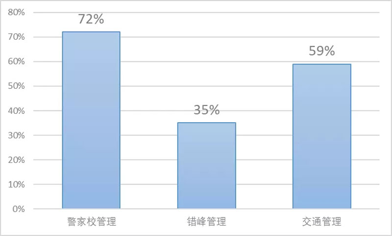 管理措施主要体现在“警家校”管理、错峰管理、交通管理三个方面,其中,“警家校”管理在南海区中学三大管理措施实施率最高,达到70%。