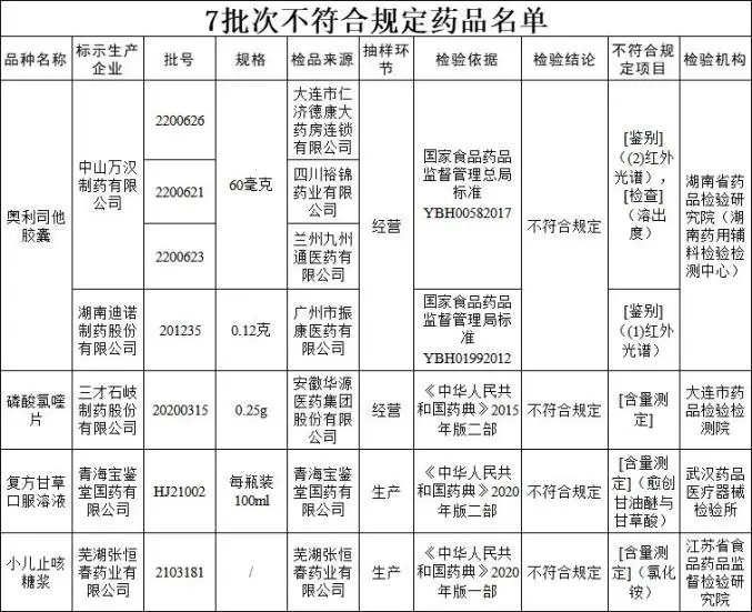 小儿止咳糖浆、复方甘草口服溶液……7批次药品不合规