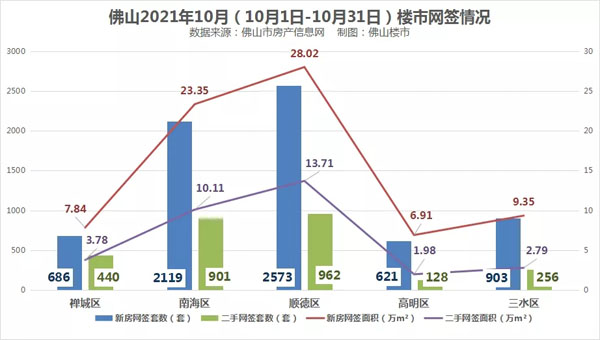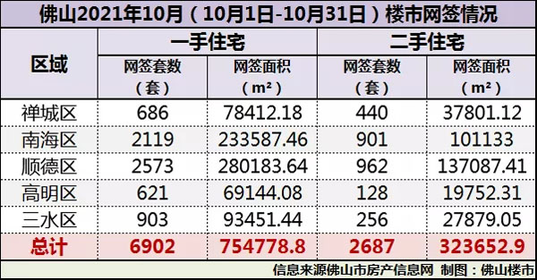 根据佛山房产信息网显示,佛山10月份网签套数6902套,网签面积75.48万方。虽与9月份4750套网签数量、53.67万方网签面积相比,分别上涨了45%、41%。