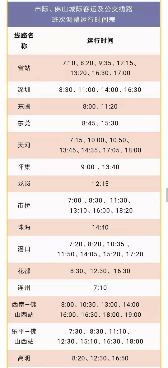 另外,2月3日起暂停发班线路包括金利、大旺、中山、长安、江门、佛山快线、佛山慢线、清远、阳山、英德、容桂、广佛线、大塘—广州滘口、迳口—佛山、三水西南至佛山西站辅助公交高铁快线。