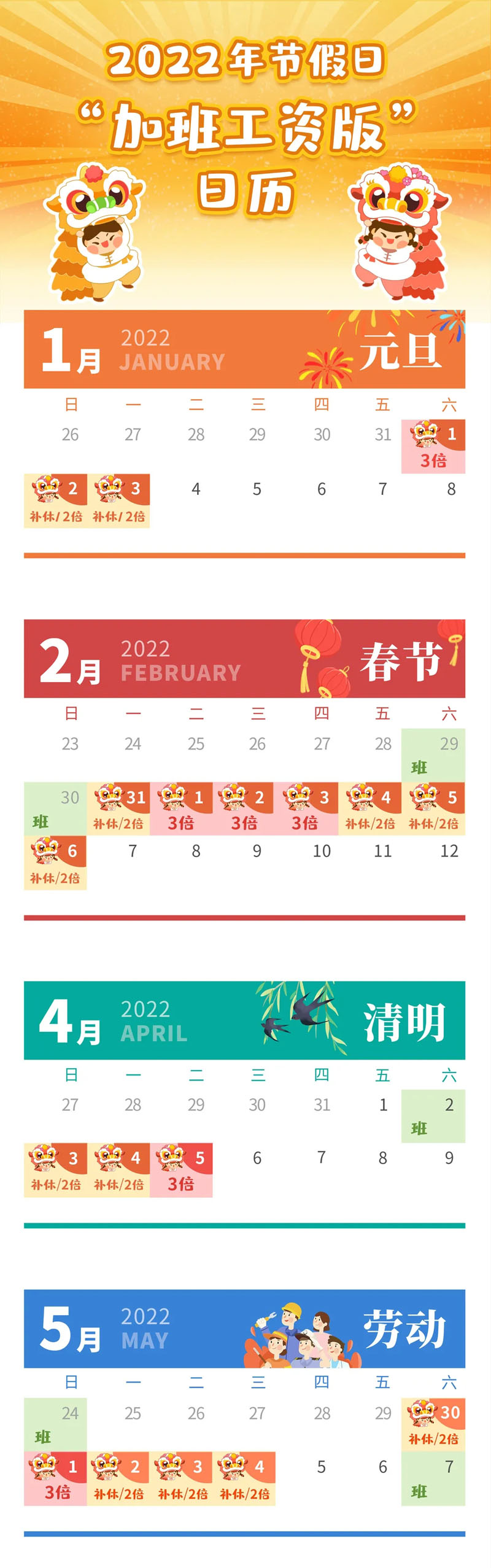 发布君还为大家准备了一张 2022年节假日“加班工资版”日历 ,对照看看,加班工资拿多少一目了然!