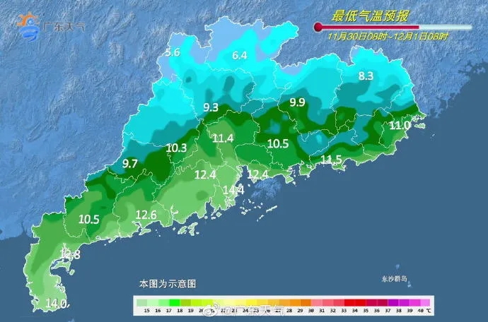 12月1日,全省晴间多云。最低气温:粤北和肇庆北部市县4~7℃,高海拔山区2℃左右,南部沿海市县11~14℃,其余市县8~11℃。