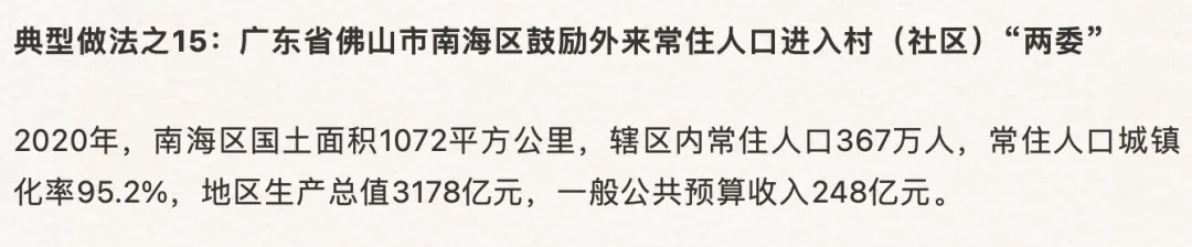 其中,佛山市南海区鼓励外来常住人口进入村(社区)“两委”这一经验做法入选,成为全国典型。