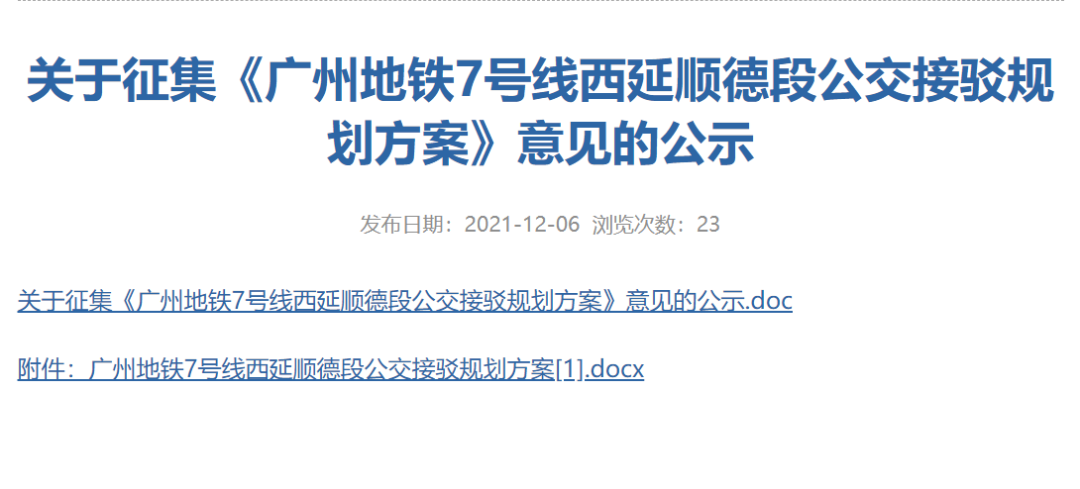 12月6日广州地铁7号线西延顺德段公交接驳规划方案正式公开征求意见