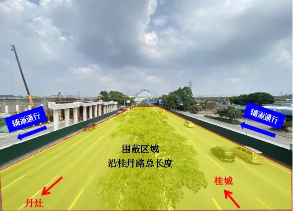 由于施工期间需要封闭桂丹路主路两条车道,桂丹路(贵广高铁-桂丹路立交)通行能力大幅下降,为避免交通拥堵,建议来往于三水、丹灶、广州之间的过境车辆可绕行广三高速、西二环高速、广明高速行驶;狮山往来桂城的可绕行广三高速、广佛新干线、兴业路、罗村大道、环站西路、环站东路。