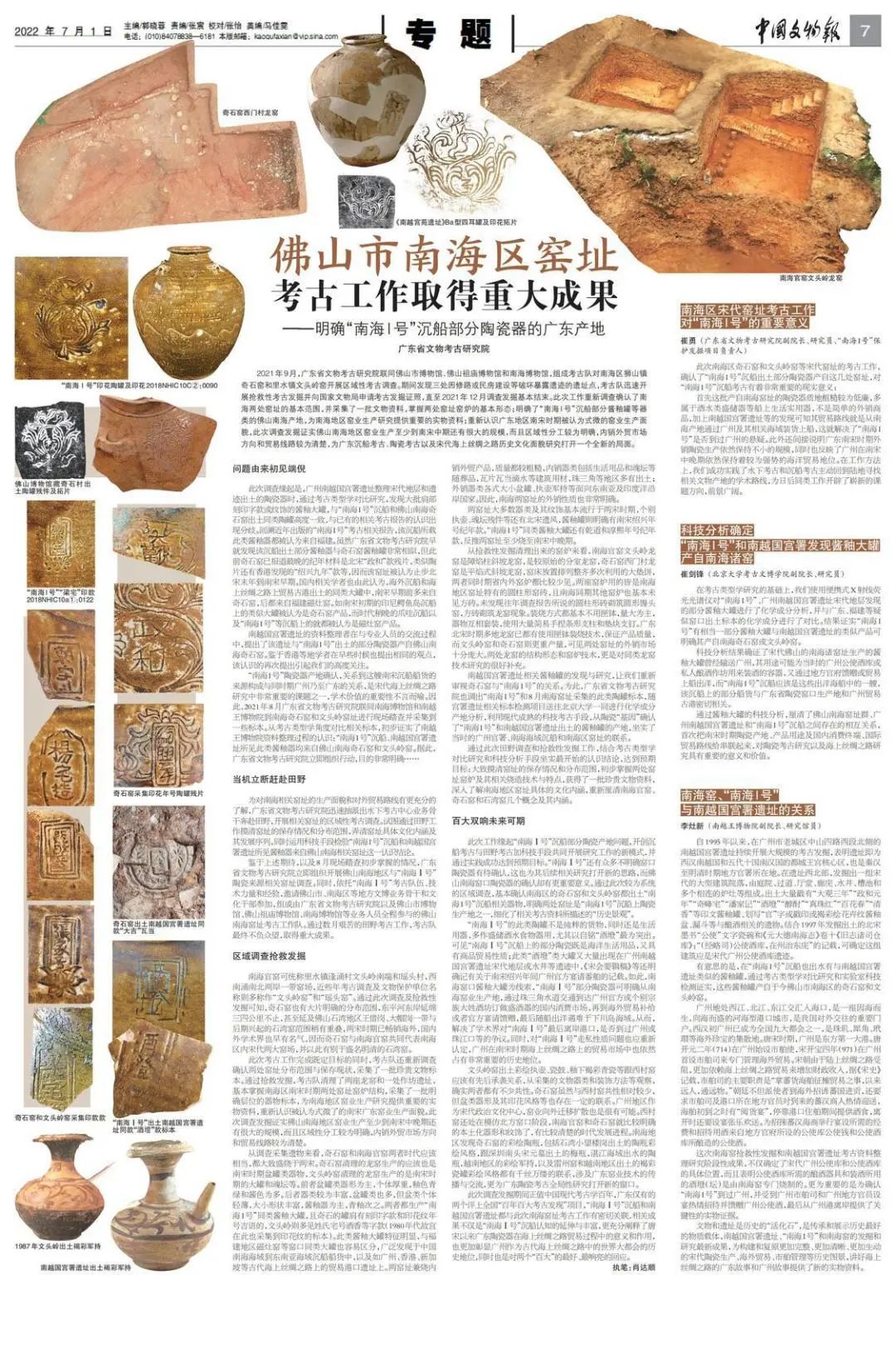 7月1日,《中国文物报》整版报道佛山市南海区狮山镇奇石窑和里水镇文头岭窑考古成果,明确了“南海I号”沉船部分酱釉罐等器类产自佛山南海。这一成果为南海地区窑业生产研究提供重要的实物资料,有助于重新认识广东地区南宋时期被认为式微的窑业生产面貌。