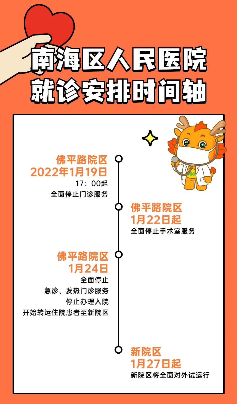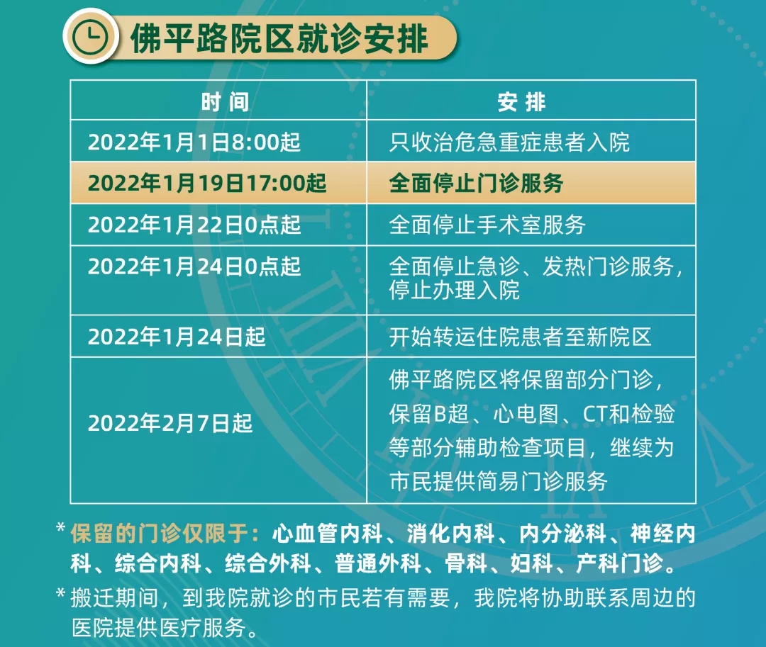 南海区人民医院佛平路院区于1月19日17:00起,全面停止门诊服务。1月22日起,全面停止手术室服务。1月24日0点起全面停止急诊、发热门诊服务,停止办理入院。1月24日起,转运住院患者至新院区。