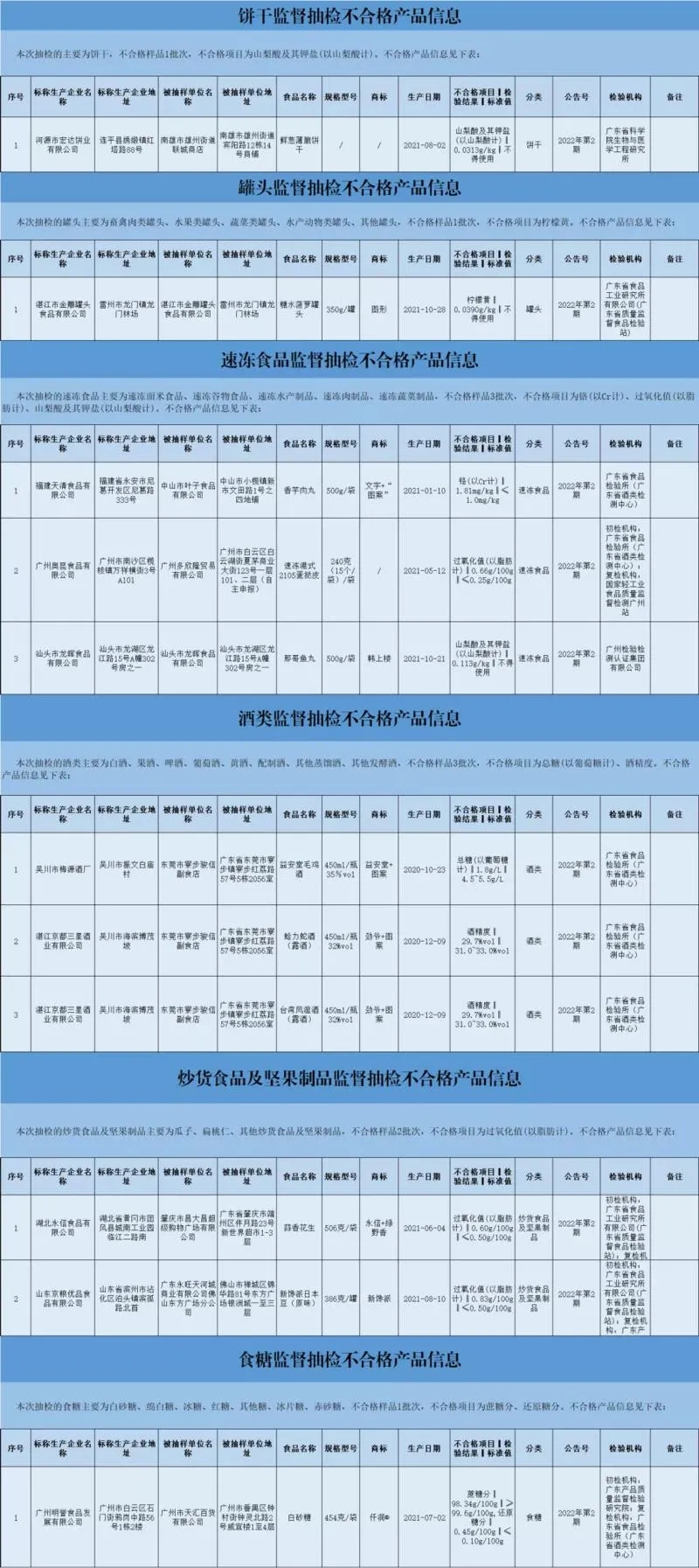 近期,广东省市场监督管理局组织抽检粮食加工品、肉制品、饼干、罐头、速冻食品、酒类、炒货食品及坚果制品、食糖等8类食品1367批次样品。根据食品安全标准检验和判定,其中抽检项目合格样品1356批次、不合格样品11批次,检出重金属污染、食品添加剂超范围使用及其他指标问题。