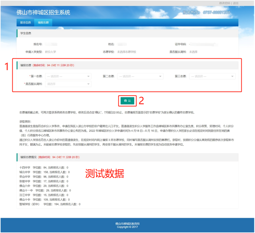 7月8日22:00后,招生报名系统将自动关闭,并封存志愿。未在规定时间内登录系统填报志愿的,视为放弃禅城区公办初中学位,区教育局不再安排学位。