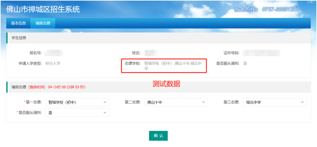 3、选择完成后点绿色按钮“确认”。确认成功后,“学生信息”栏中志愿学校出现已选的志愿学校;