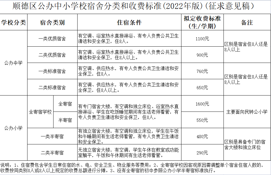 顺德区公办中小学校宿舍分类和收费标准(2022年版)(征求意见稿)