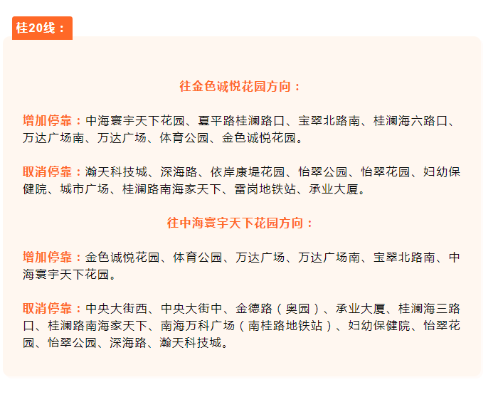 此外,今日(7月20日)起,桂20线优化调整为“中海寰宇天下花园”至“金色诚悦花园”。