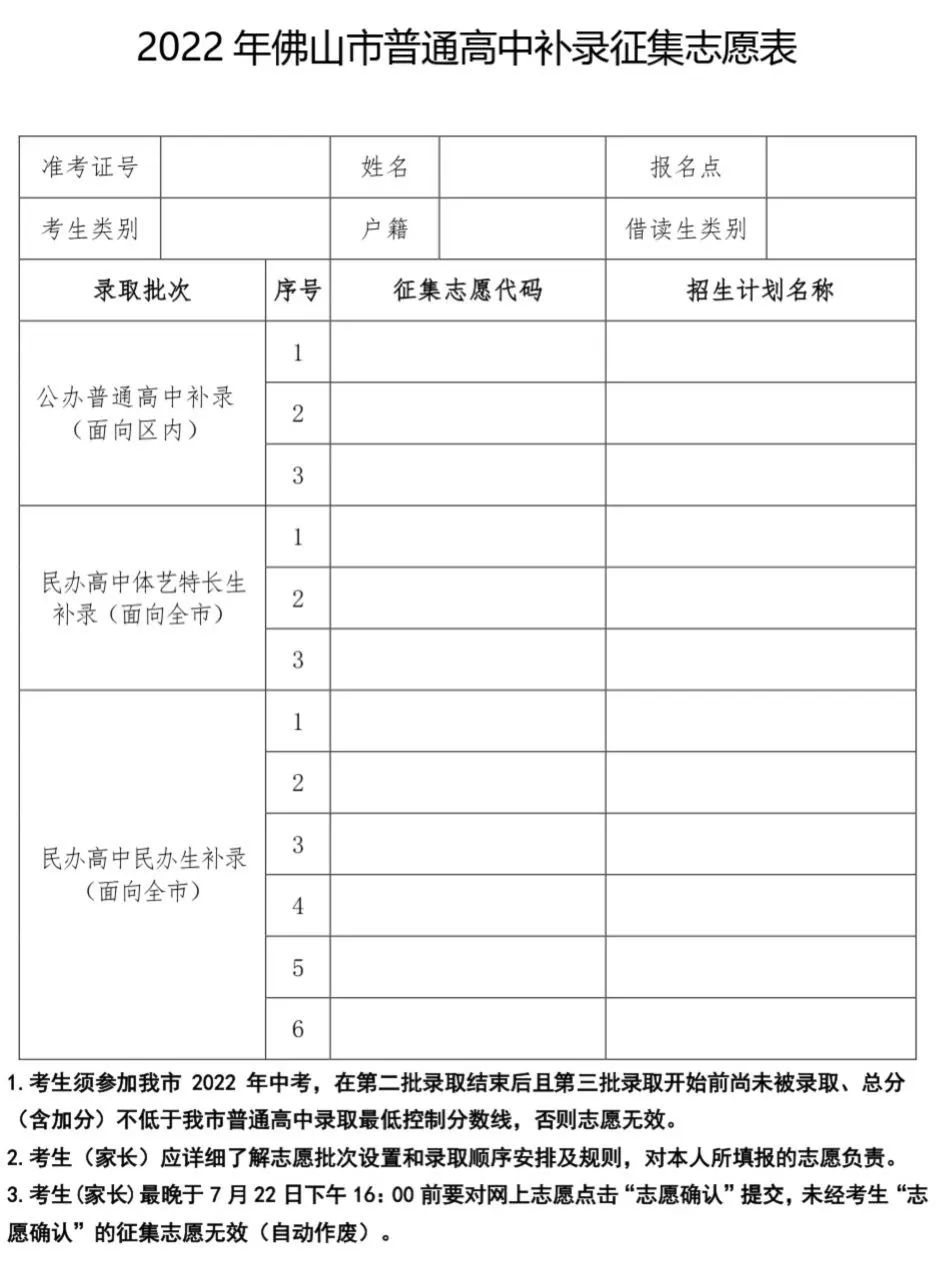 考生在7月21日上午10:00至7月22日下午16:00期间,登录佛山市中考信息管理系统征集志愿。根据考生类型可填报多所学校。考生上网征集志愿前,应仔细查阅佛山招考网发布的补录招生计划等信息,按征集志愿学校代码填报。民办普通高中的收费标准通常高于公办普通高中,相关收费标准可咨询招生学校。