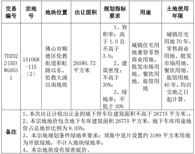 据公告显示,地块位于伦教街道彩虹路以东、伦教大涌以南,为商住性质,1<容积率≤3,绿地率不小于30%,建筑密度不大于30%,建筑限高不高于90米。