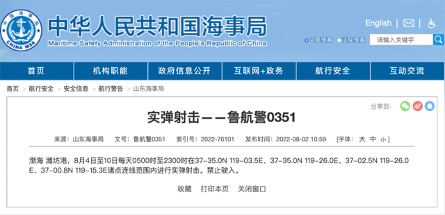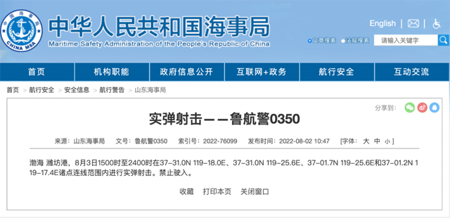据大连海事局消息,渤海北部,自8月1日1400时至8月4日2400时将在以39-50.80N 121-10.03E为中心,8海里为半径范围内进行实弹射击。禁止驶入。