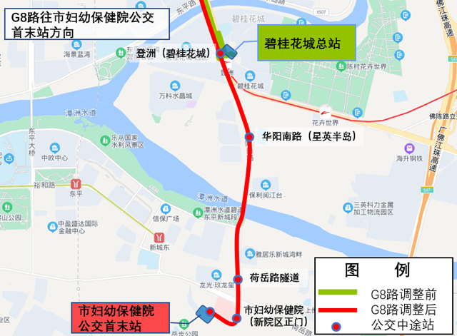 二、延长G8线路,路由由碧桂花城公交总站延伸至妇幼保健院公交首末站,加强桂城区域与新城区之间衔接