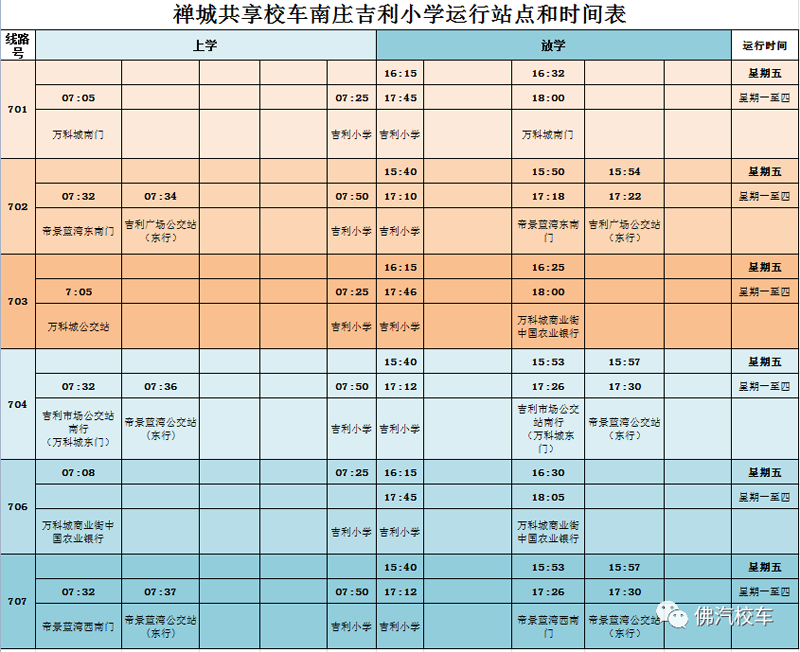 新的学期,为了更加方便同学们的出行,佛汽校车将会对环湖小学、河滘小学、澜石小学、罗格小学、吉利小学等线路优化调整,具体班次情况请见下表。