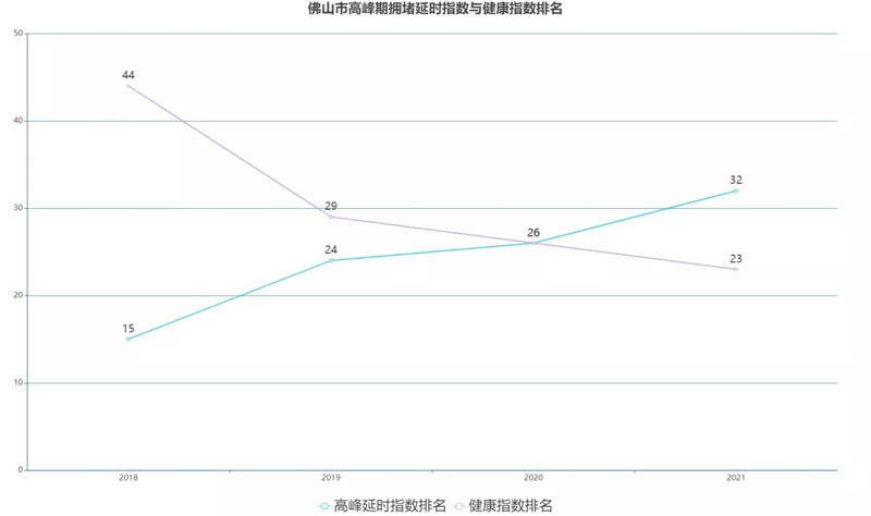 高德地图根据电子地图海量的交通出行数据,采用“拥堵延时指数”为全国主要城市交通拥堵状况排名。2018年至2021年,佛山在全国的排名分别为15位、24位、26位、32位(排名靠前的年份,拥堵相对严重)。
