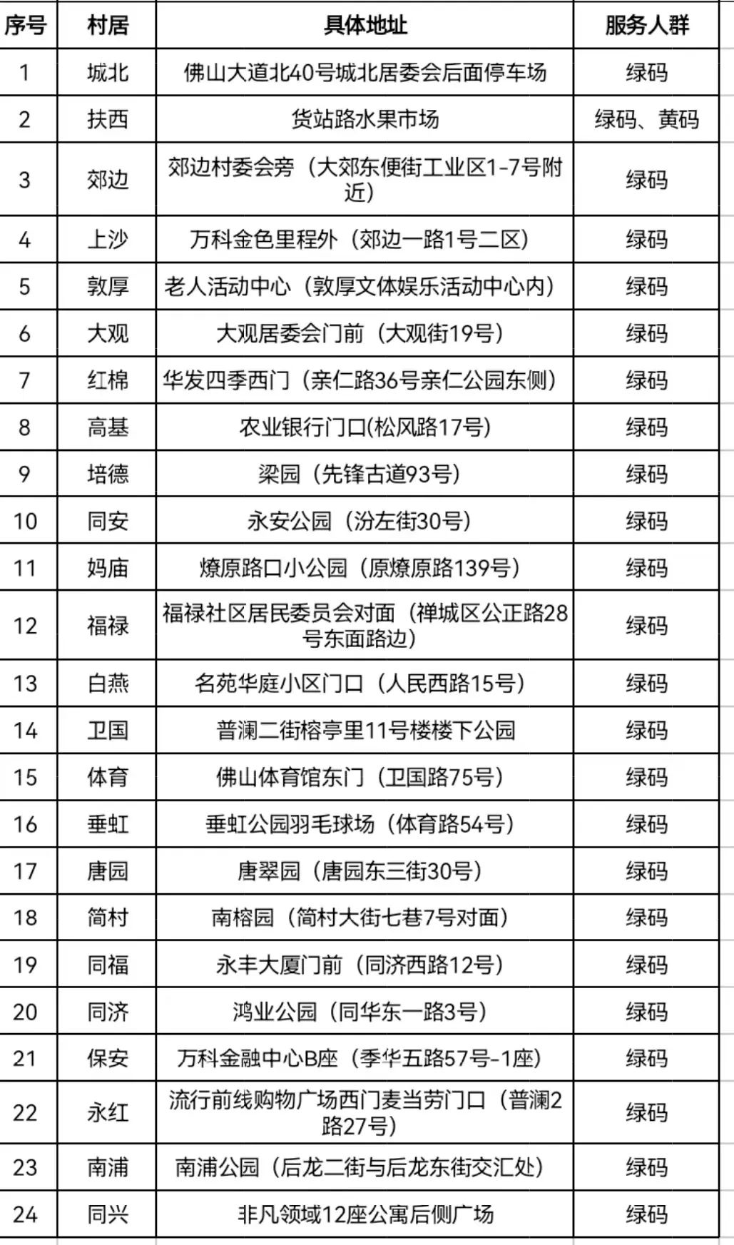 9:00-15:00:城北、扶西、郊边、上沙、敦厚、大观、红棉、高基、培德、同安、妈庙、福禄、白燕、卫国、体育、垂虹、唐园、简村、同福、同济、保安、永红、南浦、同兴、同华。其中扶西点设1条黄码人员通道。